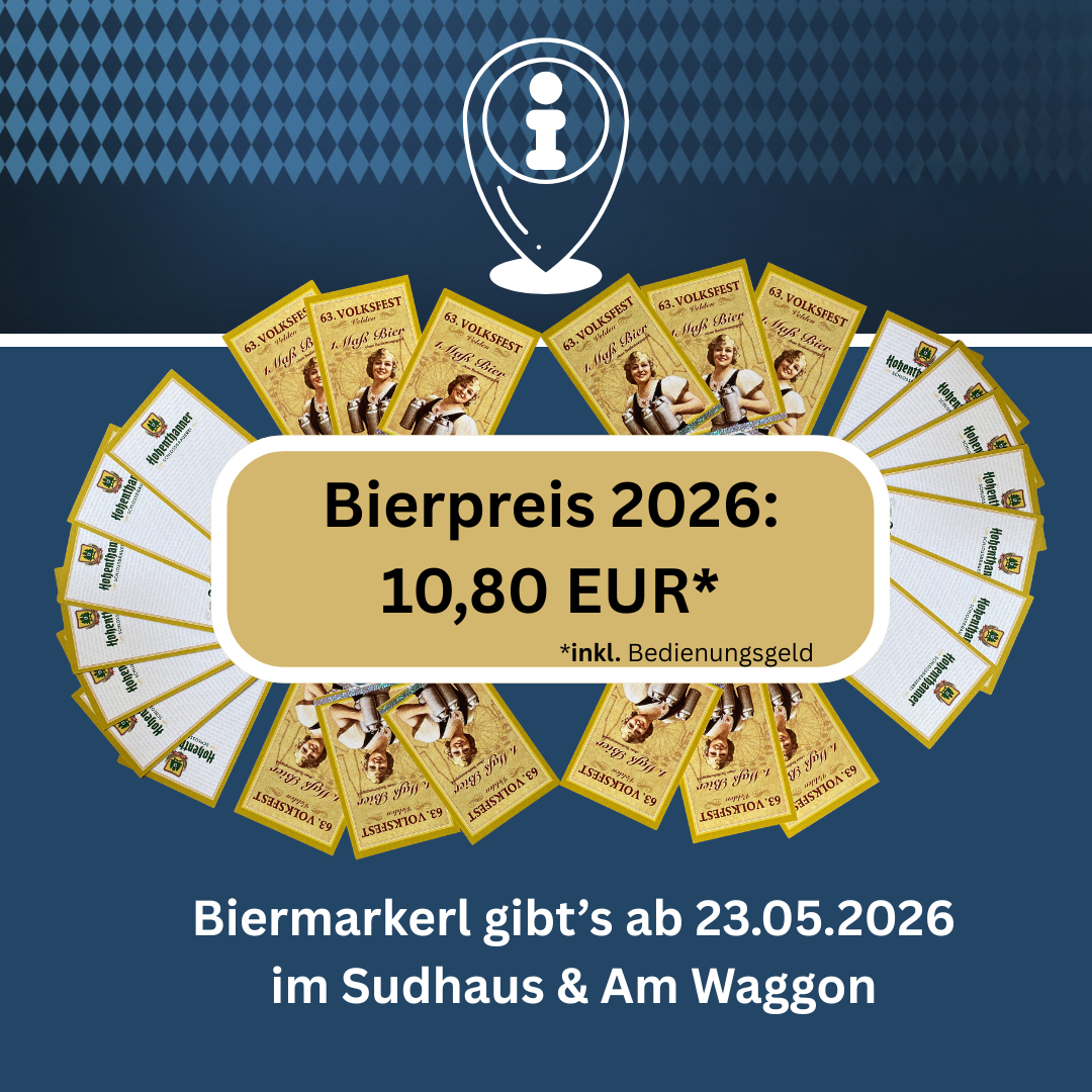 Ab Donnerstag, 23.05.2026 sind die 2026er Biermarkerl beim Festwirt im Sudhaus und im Biergarten "Am Waggon" zum Preis von 9,70 EUR erhältlich; der Bierpreis liegt heuer inkl. Bedienungsgeld bei 10,80 EUR.